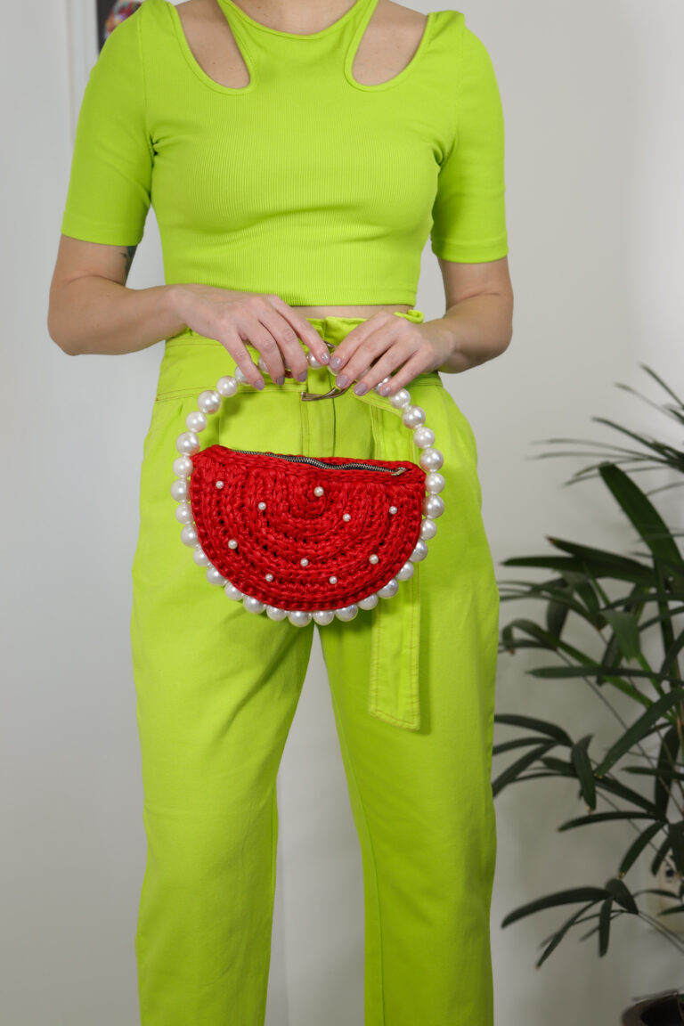 Com seu formato meia-lua, textura marcante e alça de pérolas, a Tiana é o equilíbrio perfeito entre o artesanal e o sofisticado.